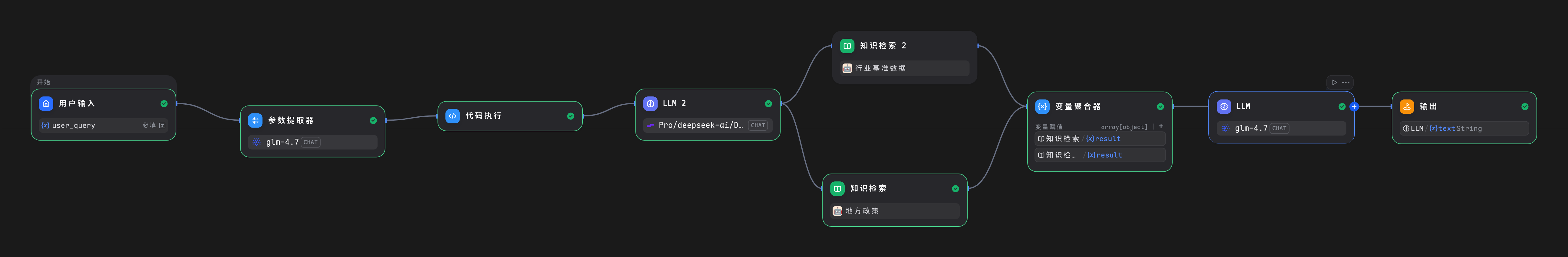 接下来就是知识检索,我将文件分成了两个知识库,一个是行业基准数据,一个是地方政策。索引方式都是高质量,使用zhipu的embedding-3模型,检索方式采用混合检索,使用有道的bcererankbaseV1模型,top-K设置为7。